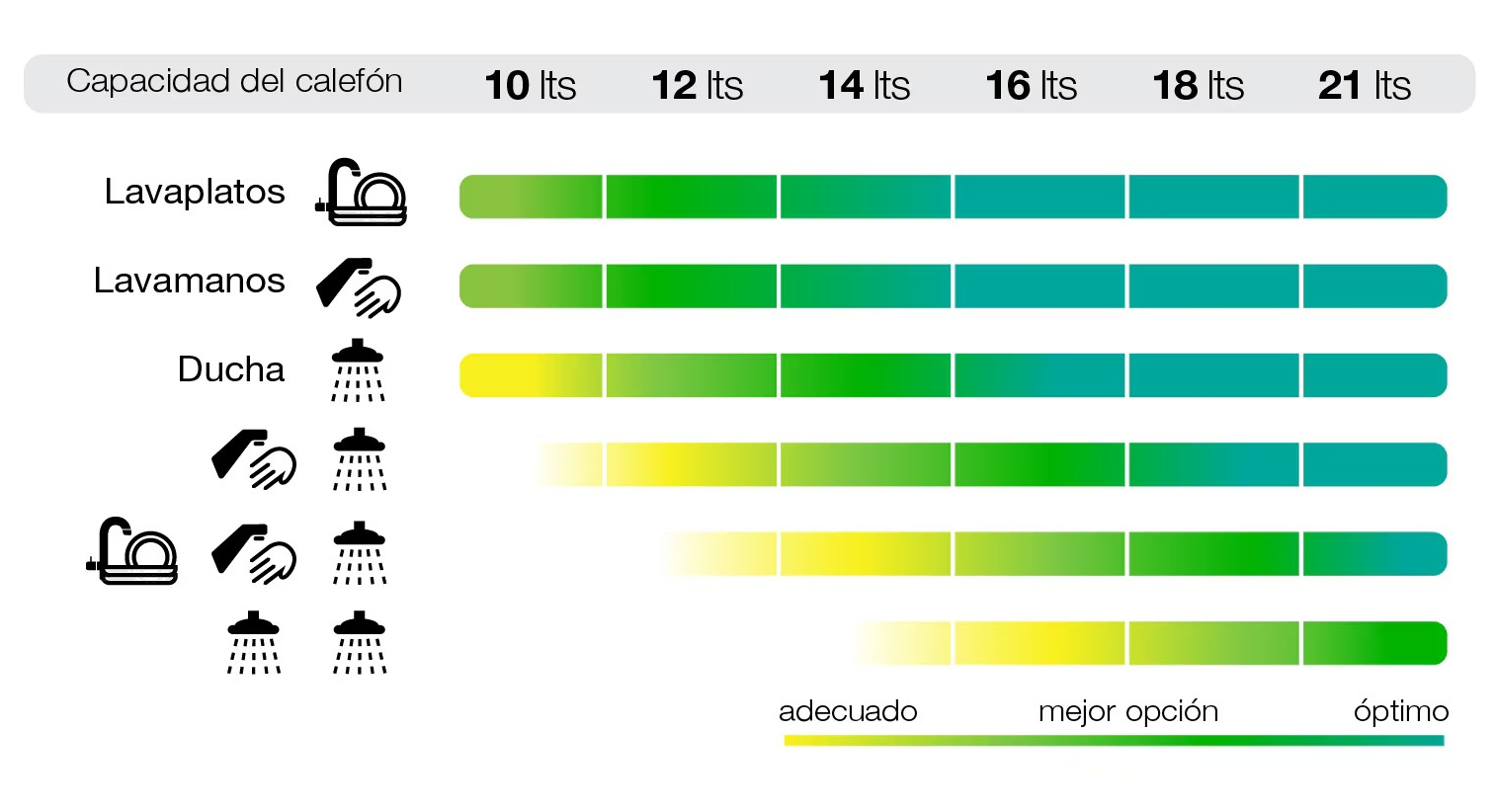 Antes de comprar, verifica el tipo de gas que usa tu hogar. Puede ser gas natural por cañería o gas licuado en cilindros. ¿Cuántas duchas, lavamanos y lavaplatos tienes en casa? La capacidad del calefont dependerá de la cantidad de agua caliente que requieras en casa.