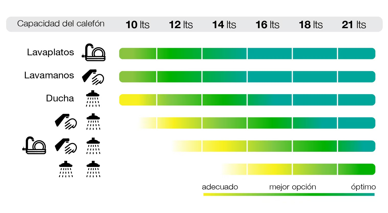 Antes de comprar, verifica el tipo de gas que usa tu hogar. Puede ser gas natural por cañería o gas licuado en cilindros. ¿Cuántas duchas, lavamanos y lavaplatos tienes en casa? La capacidad del calefont dependerá de la cantidad de agua caliente que requieras en casa.