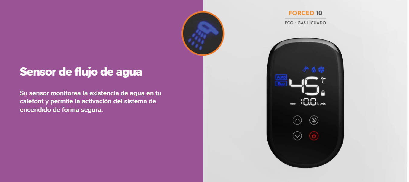 Detecta automáticamente el paso del agua y activa el sistema de encendido electrónico, asegurando un funcionamiento seguro y sin desperdicios.