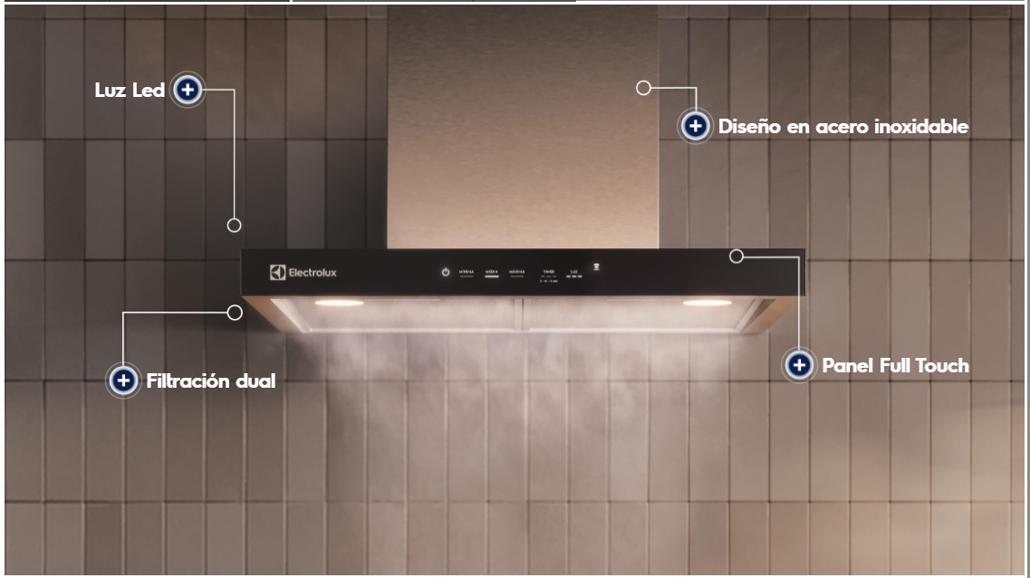 Renueva tu cocina con estilo, tecnología y máxima eficiencia con la Campana de Pared Electrolux CE6TF. Diseñada para quienes buscan elegancia y un ambiente libre de humo y olores, esta campana combina alto poder de succión, panel digital full touch y función 2 en 1 (extractor y purificador).