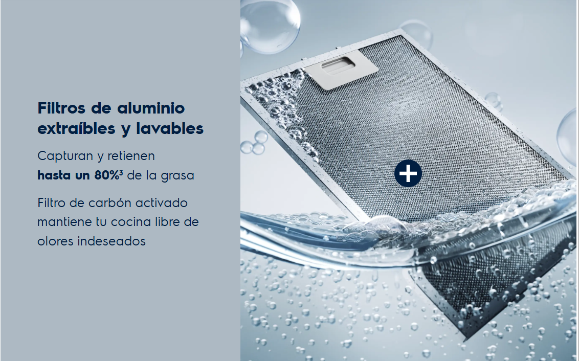 🧼 Filtros de aluminio extraíbles y lavables: Capturan hasta 80% de la grasa, manteniendo tu cocina más limpia y libre de olores.