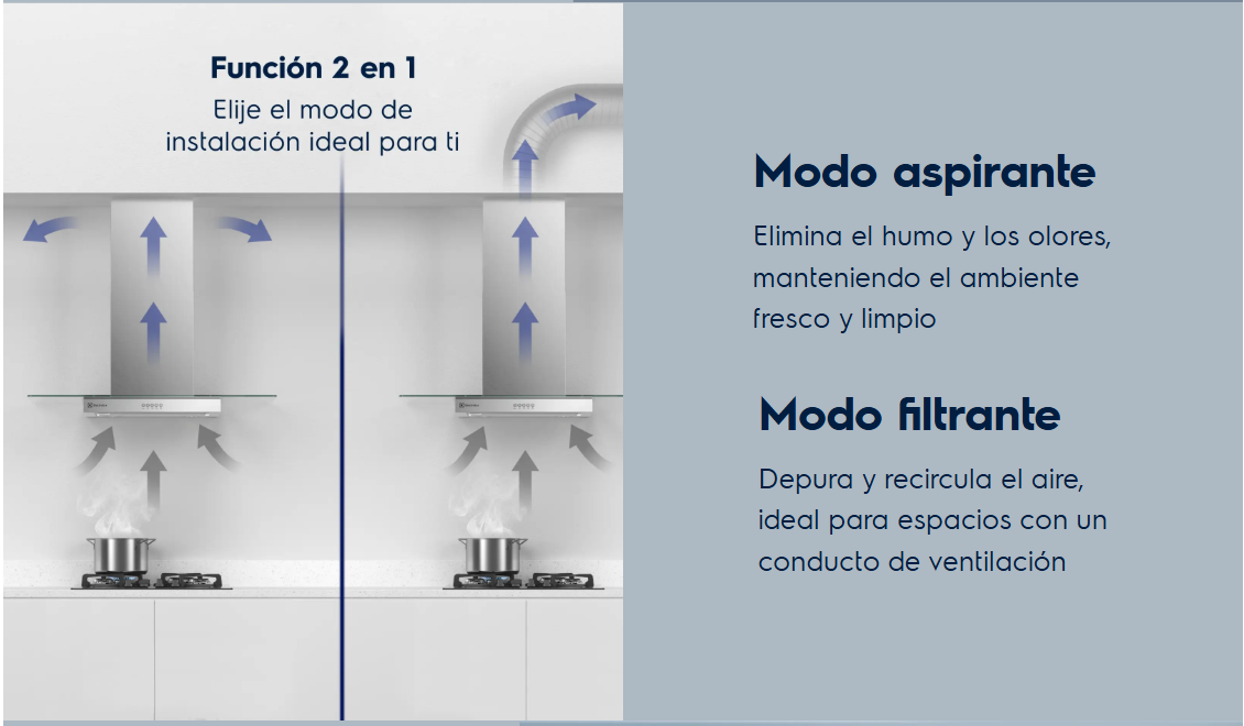➜ Modo filtrante: Purifica y recircula el aire con filtro de carbón activado, perfecto para cocinas sin salida al exterior.