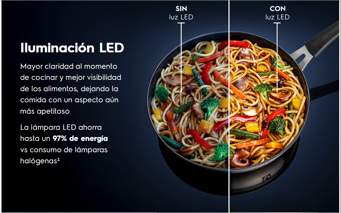 💡 Iluminación LED empotrada: Mayor visibilidad y claridad al cocinar. Ahorra hasta 97% de energía frente a lámparas halógenas³ y conserva los colores naturales de los alimentos.
