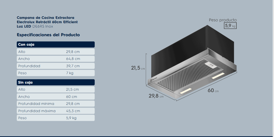 CAMPANA DE COCINA EXTRACTORA ELECTROLUX RETRÁCTIL 60CM EFFICIENT LUZ LED DE6RS INOX