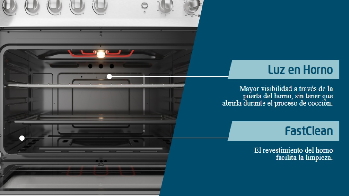 5 quemadores, incluyendo laterales móviles en horno, para cocinar un 60% más rápido y con la flexibilidad que necesitas.
