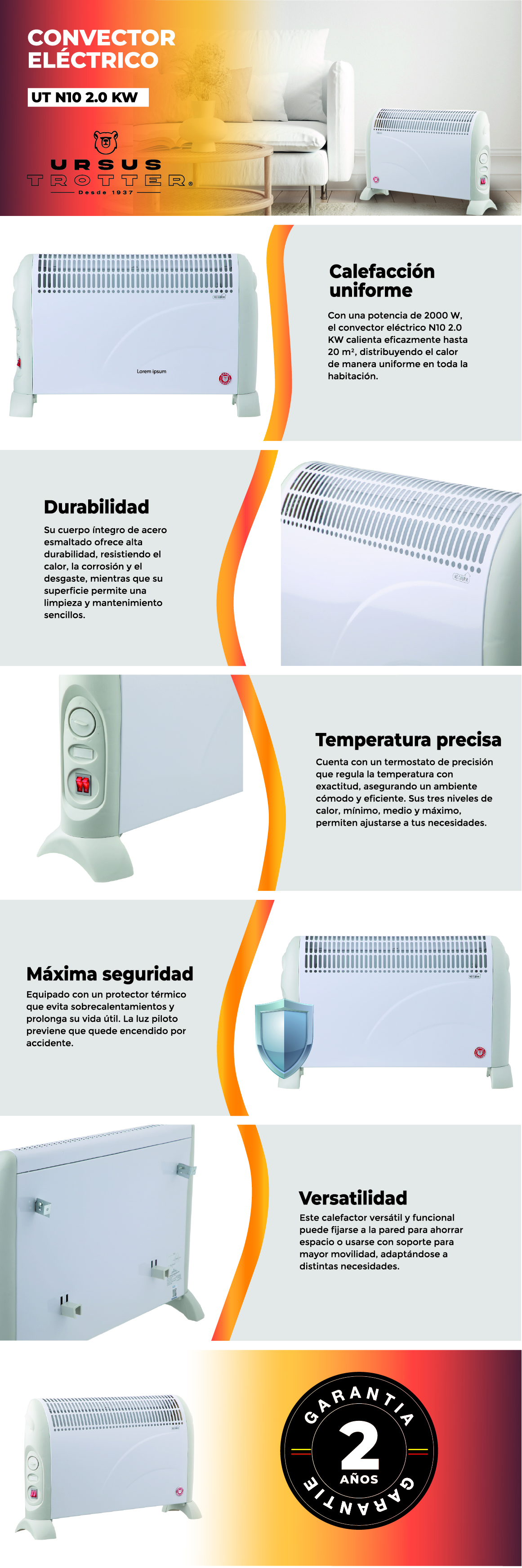 Disfruta del invierno con la calidez y eficiencia del Convector Eléctrico Ursus Trotter UT N10, diseñado para entregar un calor uniforme, silencioso y seguro. Con 2000 W de potencia, este convector es ideal para calentar espacios de hasta 20 m² sin complicaciones. Perfecto para instalar en muro o usar con base de apoyo, se adapta a cualquier ambiente gracias a su diseño compacto y moderno. ❄️➡️🔥
