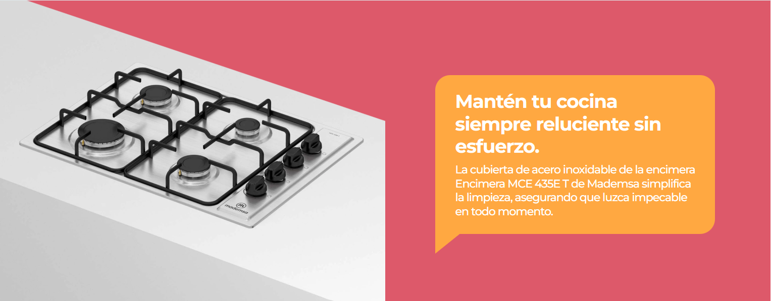 Su cubierta satinada de acero inoxidable combina resistencia y estilo moderno. Las perillas extraíbles y los quemadores sellados permiten una limpieza rápida y profunda.