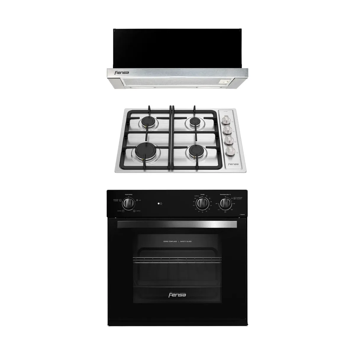 KIT HORNO EMPOTRABLE ELÉCTRICO F 1060N A 66L + ENCIMERA A GAS FCE 4HF T + CAMPANA DE COCINA EXTRACTORA FX 6270 FENSA