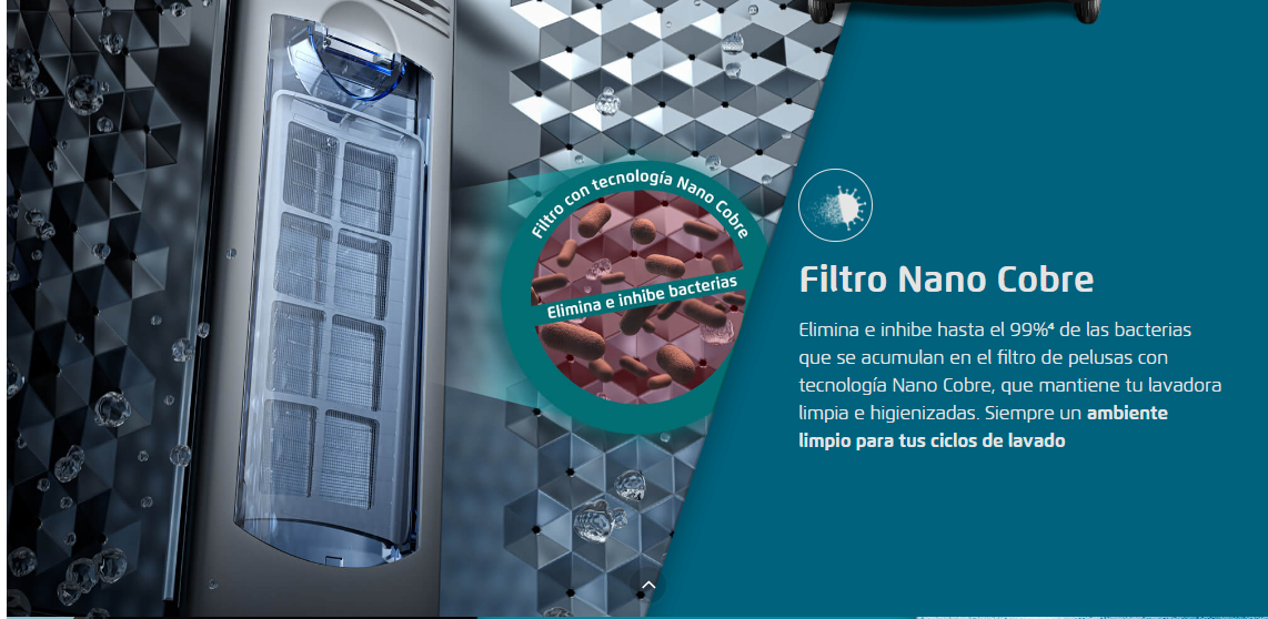 Con su Función Ahorro de Agua, puedes reducir hasta un 40% del consumo por ciclo, sin sacrificar limpieza ni frescura 💦. Su innovador Filtro Nano Cobre elimina e inhibe hasta el 99% de bacterias 🦠, manteniendo tu lavadora siempre higienizada y tus prendas más limpias.