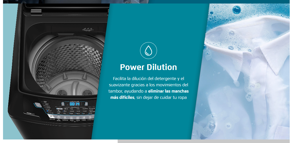 👕 Power Dilution te garantiza una mejor disolución del detergente y suavizante gracias a su poderoso movimiento de agua, mientras que la opción Lavado Rápido de 14 minutos es ideal para ropa ligeramente sucia cuando tienes poco tiempo.