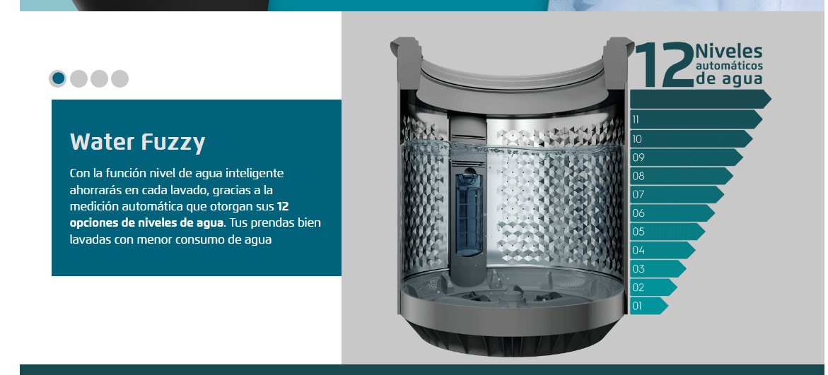 Además, su Puerta Cierre Fácil con vidrio transparente brinda seguridad y visibilidad total del lavado, y su sistema Water Fuzzy ajusta automáticamente el nivel de agua según la carga, optimizando cada lavado.