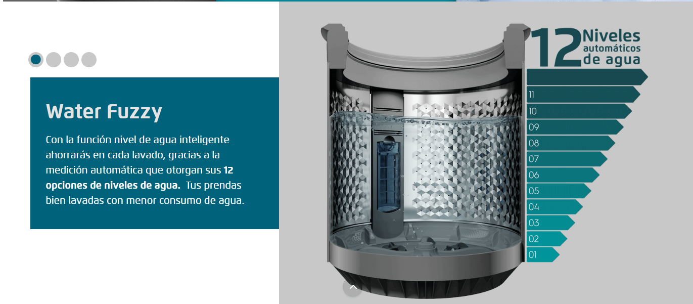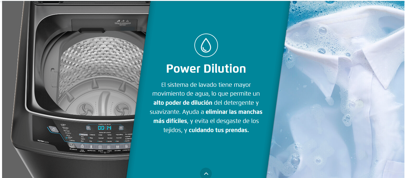 Sistema de lavado con mayor movimiento de agua que mejora la disolución del detergente y suavizante, cuidando tus tejidos y eliminando manchas difíciles.