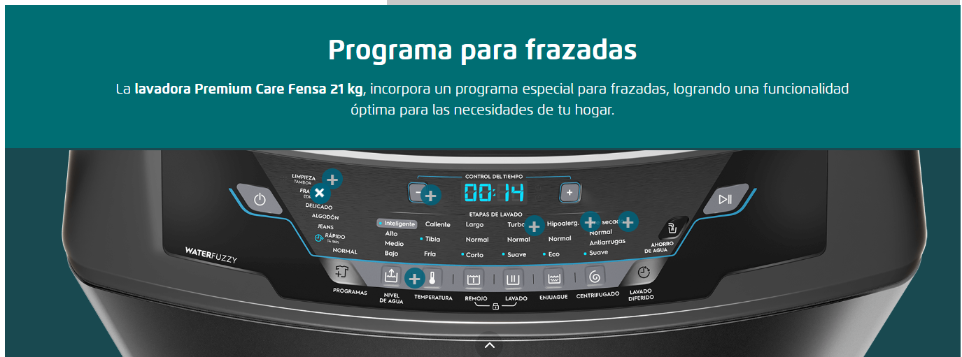 ¡Haz que el lavado de tu ropa sea más eficiente, rápido y cuidadoso con la 💎 Lavadora Fensa Premium Care 21kg Onix! Ideal para familias grandes o quienes lavan grandes volúmenes de ropa 👕👖. Con tecnología de Ahorro de Agua y Energía, obtendrás máximo rendimiento con menor consumo, cuidando tanto tus prendas como el medio ambiente 🌎.