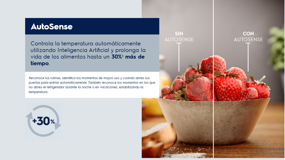 Con su tecnología AutoSense, este refrigerador ajusta la temperatura automáticamente según tus hábitos de uso. La IA identifica cuándo abres más o menos las puertas y regula el enfriamiento para mantener la frescura hasta 30% más tiempo ⏳❄️.