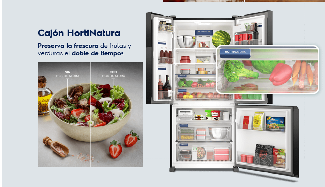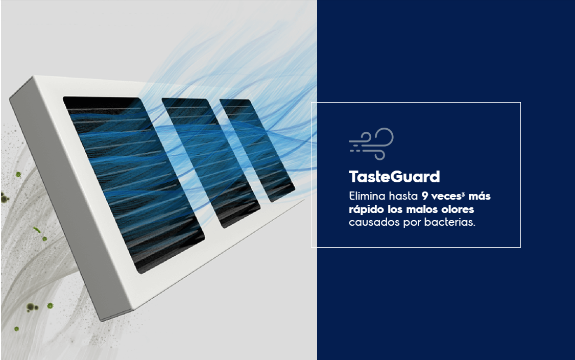 El cajón HortiNatura conserva frutas y verduras hasta 2 veces más frescas, mientras que el sistema TasteGuard elimina los malos olores hasta 9 veces más rápido, asegurando un ambiente siempre limpio y sin bacterias 🌿🚫😷.