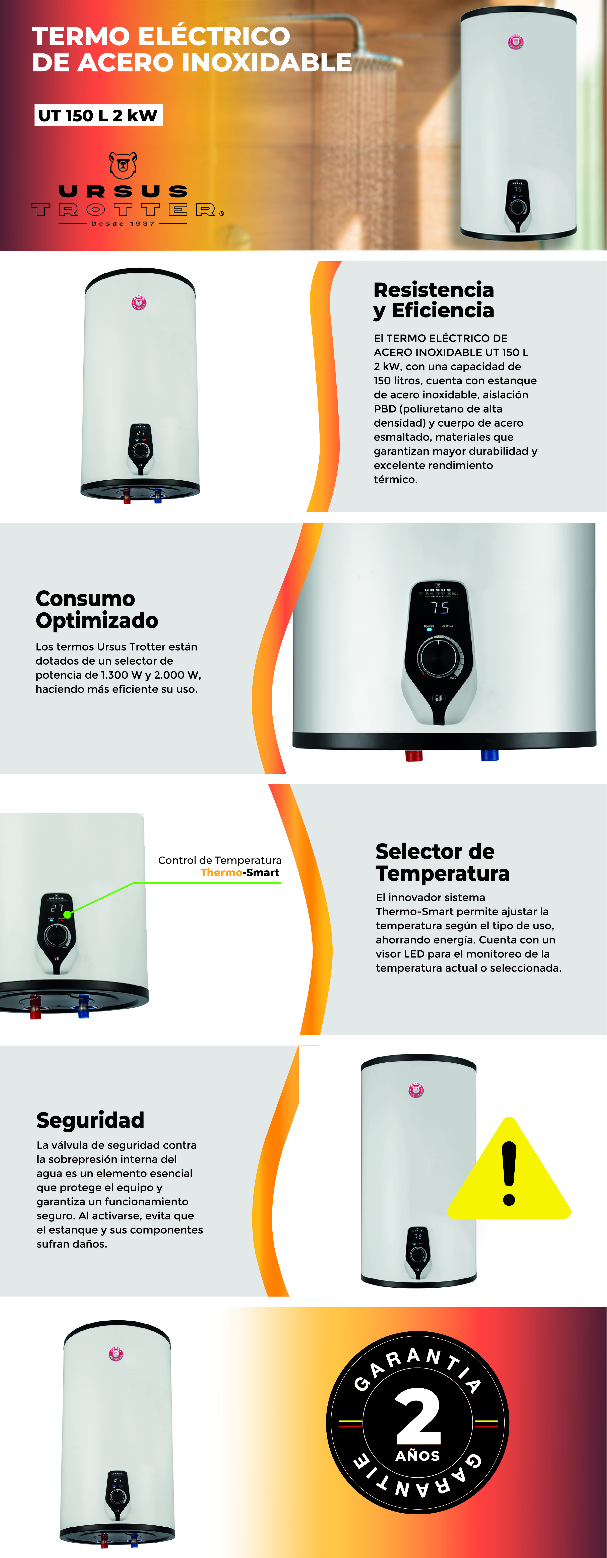 🌟 ¡Agua caliente siempre lista para ti y tu familia! El Termo Eléctrico UT 150L de Ursus Trotter es la solución ideal para hogares de alta demanda. Gracias a su estanque de acero inoxidable austenítico, tecnología eficiente y un diseño robusto, obtendrás rendimiento, durabilidad y seguridad en un solo producto. ✅