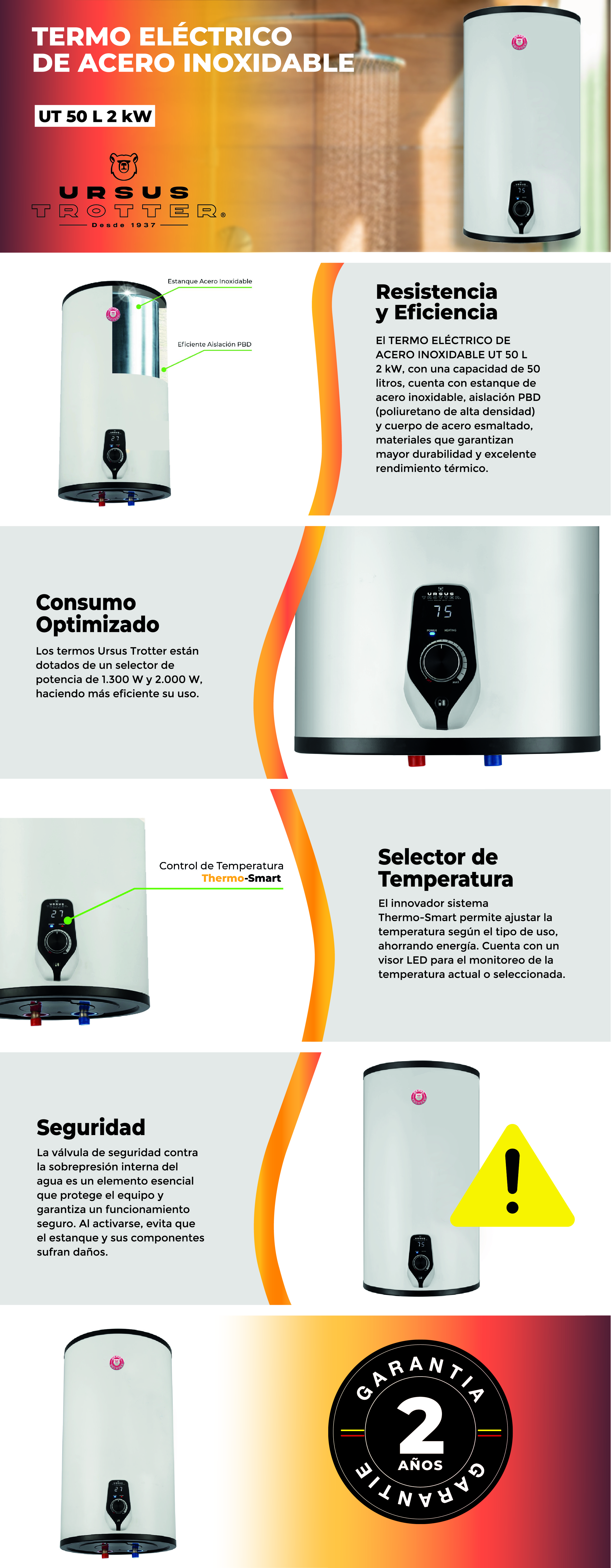 ¡Dile adiós al agua fría y dale la bienvenida al confort absoluto con el Termo Eléctrico Ursus Trotter UT 50L! 🙌 Este modelo de instalación mural, diseñado con un estanque de acero inoxidable austenítico, asegura mayor durabilidad y resistencia a la corrosión 🛡️. Con su pantalla LED digital, selector de potencia y eficiente aislación térmica, es la opción ideal para un hogar moderno, cómodo y energéticamente eficiente ⚡🏠.